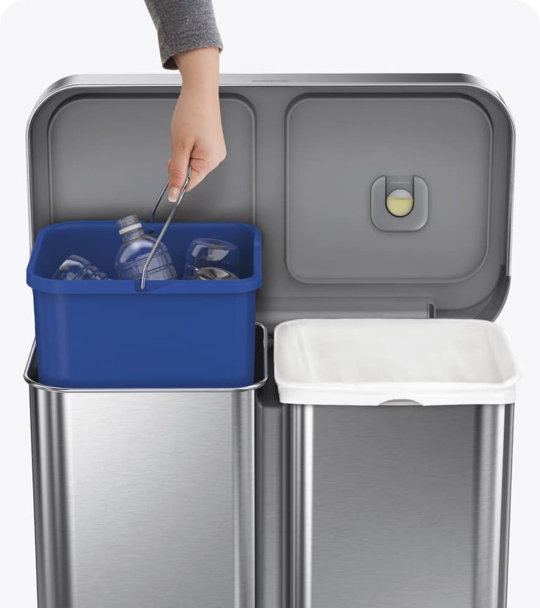 Our dual compartment option makes sorting trash look good! Each side has a generous capacity, and emptying is easy with a plastic bucket on the recycling side and a liner pocket in the trash compartment.